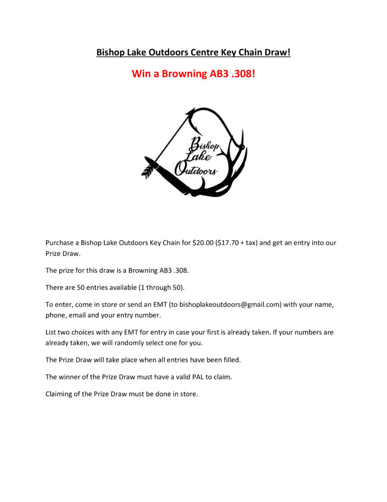 Purchase a Bishop Lake Key Chain for $20.00 ($17.70 + tax) either in store or by EMT for your chance to win!